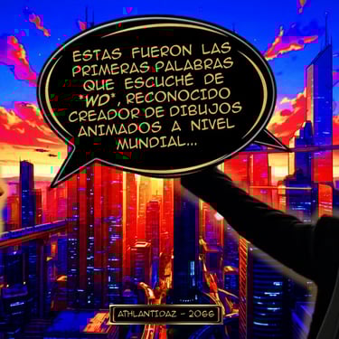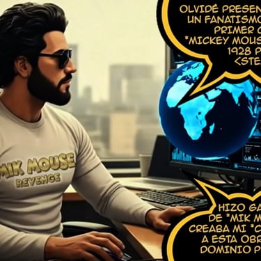 En este Comic IA de "Mik Mouse" creado como historia paralela de su dominio público "Steamboat Willie" respeté al pie de la letra NO tocar la idea conceptual inicial de este Cortometraje de Disney que tenia un Mickey Mouse un poco desarreglado, sin ideas claras en argumento creativo infantil y sin la instancia de persuasión que sin dudas es la mas atractiva del ratón mas famoso del mundo, en este proyecto he tratado de releer la sugestión mercantil del dominio público de Mickey desde el Formato Cómic IA y me conecto con algunas practicas bien novedosas implementadas en el área comercial y publicitaria de este "Ratón Mickey", por algo este personaje es una Conexión generacional que por ha recaudado millones de dólares.