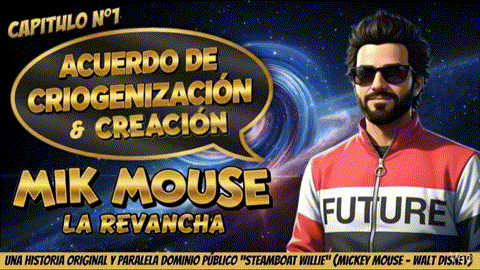 En este Comic IA de "Mik Mouse" creado como historia paralela de su dominio público "Steamboat Willie" respeté al pie de la letra NO tocar la idea conceptual inicial de este Cortometraje de Disney que tenia un Mickey Mouse un poco desarreglado, sin ideas claras en argumento creativo infantil y sin la instancia de persuasión que sin dudas es la mas atractiva del ratón mas famoso del mundo, en este proyecto he tratado de releer la sugestión mercantil del dominio público de Mickey desde el Formato Cómic IA y me conecto con algunas practicas bien novedosas implementadas en el área comercial y publicitaria de este "Ratón Mickey", por algo este personaje es una Conexión generacional que por ha recaudado millones de dólares.